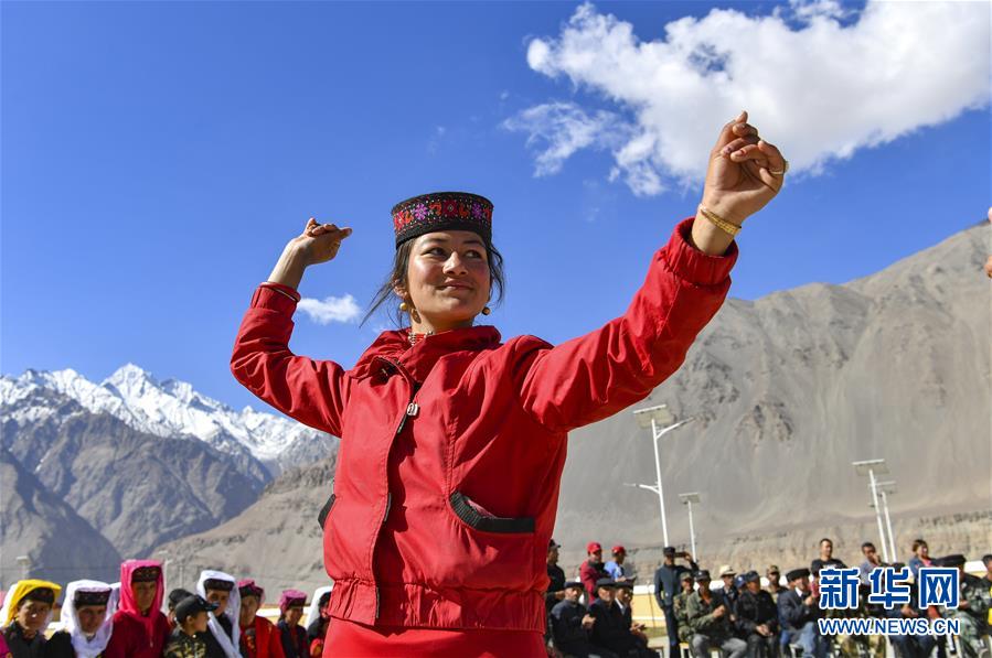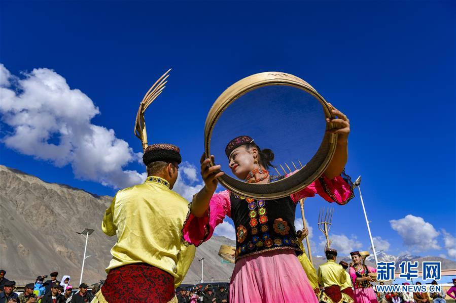 在熱斯喀木村,新疆塔什庫爾干塔吉克自治縣文工團(tuán)演員為村民表演國家級非物質(zhì)文化遺產(chǎn)——塔吉克族鷹舞(6月6日攝)。新華社記者胡虎虎攝