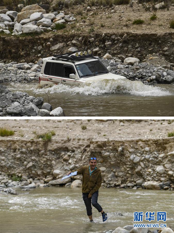 拼版照片:上圖為新疆塔什庫爾干塔吉克自治縣文工團(tuán)的車輛通過一處涉水路段,前往熱斯喀木村演出;下圖為一名文工團(tuán)演員從水里撿起車輛過河時(shí)被沖掉的車牌(6月5日攝)。新華社記者胡虎虎攝