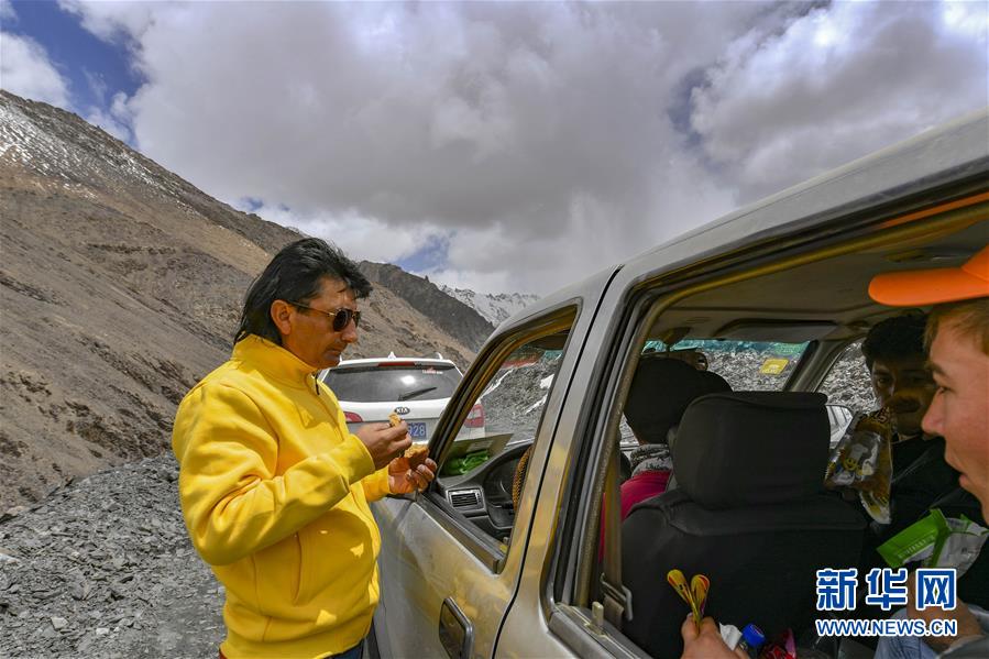 去往達(dá)布達(dá)爾鄉(xiāng)熱斯喀木村途中,塔縣文工團(tuán)演員在吃干糧(6月5日攝)。新華社記者胡虎虎攝