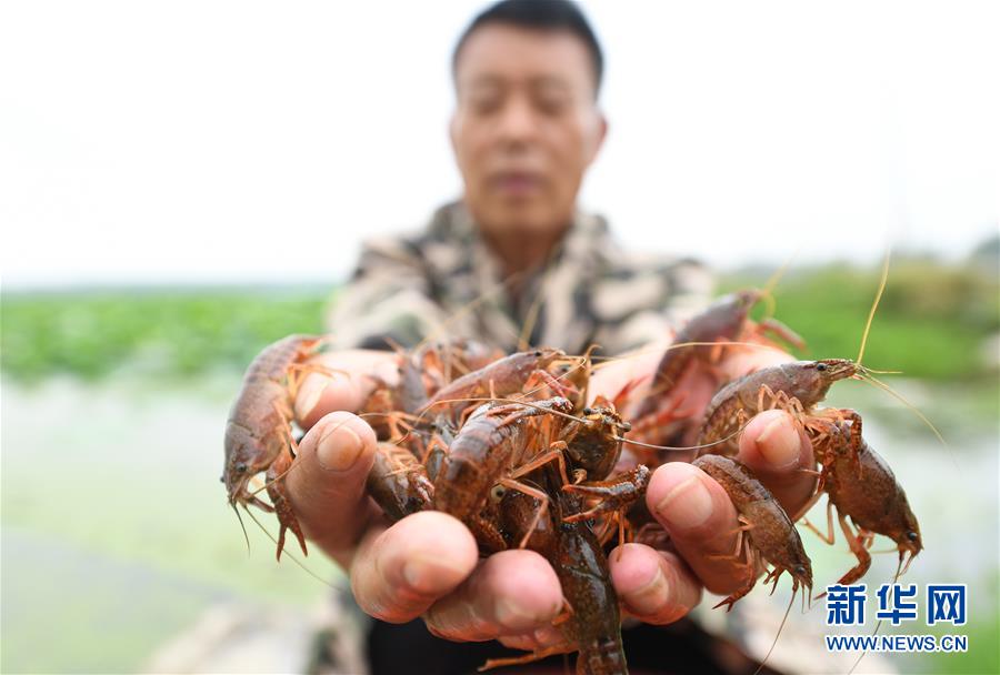6月9日,在宿遷市宿城區(qū)中揚(yáng)鎮(zhèn)一家淺水藕套養(yǎng)小龍蝦合作社,負(fù)責(zé)人王乃國在展示蝦苗(無人機(jī)照片)。新華社記者季春鵬攝