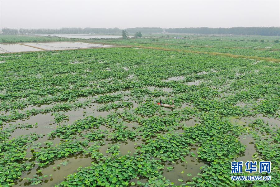 6月9日,在宿遷市宿城區(qū)中揚(yáng)鎮(zhèn)一家淺水藕套養(yǎng)小龍蝦合作社,負(fù)責(zé)人王乃國在取蝦苗(無人機(jī)照片)。新華社記者季春鵬攝
