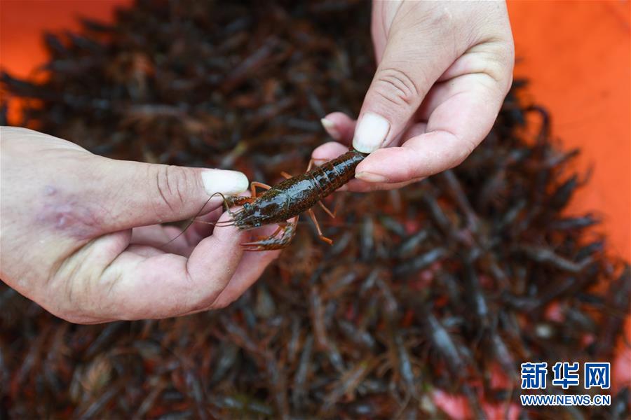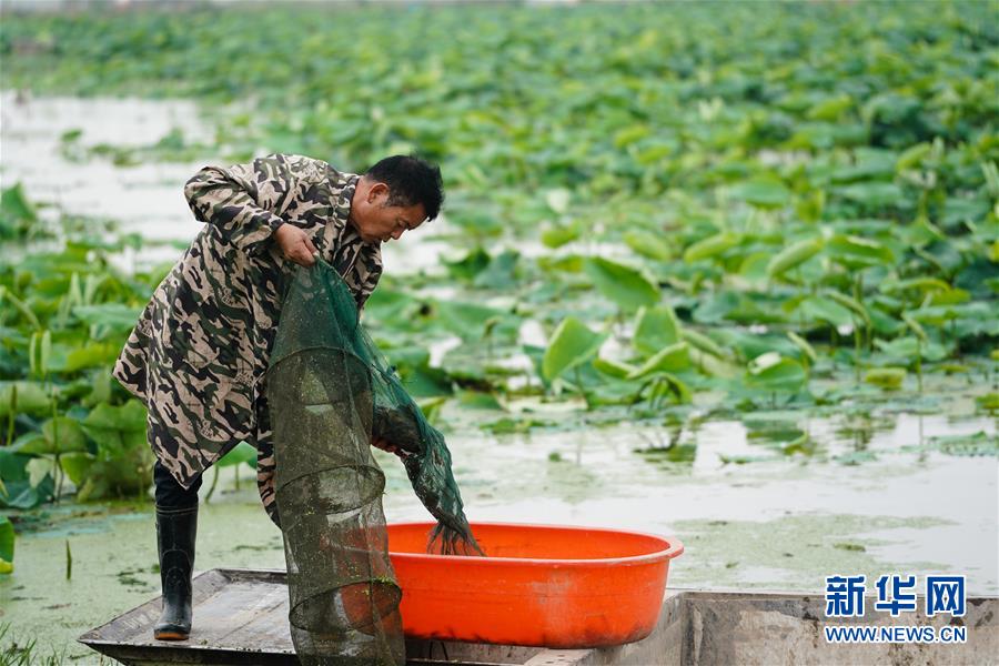6月9日,在宿遷市宿城區(qū)中揚(yáng)鎮(zhèn)一家淺水藕套養(yǎng)小龍蝦合作社,工人在給小龍蝦喂飼料。新華社記者季春鵬攝