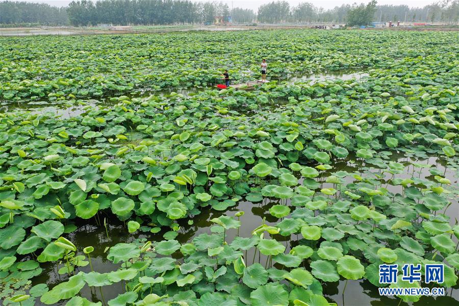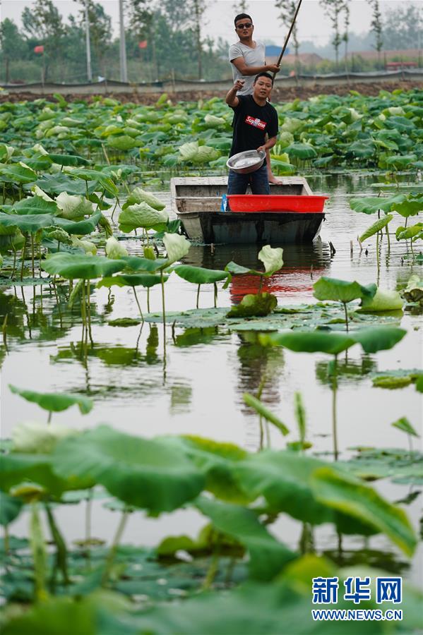 6月9日,在宿遷市宿城區(qū)中揚(yáng)鎮(zhèn)一家淺水藕套養(yǎng)小龍蝦合作社,負(fù)責(zé)人王乃國(右)在取蝦苗(無人機(jī)照片)。新華社記者季春鵬攝