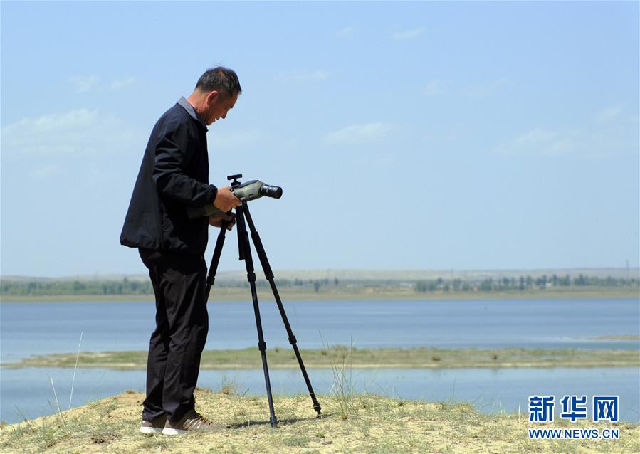 6月9日,鄂爾多斯遺鷗國家級自然保護(hù)區(qū)東勝管理站站長任永奇,用望遠(yuǎn)鏡觀察泊江海子鳥類生活情況。近年來,在當(dāng)?shù)卣亩喾N措施治理下,曾經(jīng)水面萎縮的內(nèi)蒙古自治區(qū)鄂爾多斯市境內(nèi)的泊江海子水量逐漸恢復(fù)。近期,包括遺鷗在內(nèi)的40多種鳥類來此棲息,泊江海子重新成為鳥類的樂園。新華社記者賈立君攝