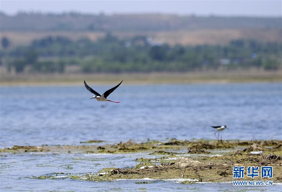 這是6月9日在泊江海子拍攝的黑翅長腳鷸。近年來,在當?shù)卣亩喾N措施治理下,曾經(jīng)水面萎縮的內蒙古自治區(qū)鄂爾多斯市境內的泊江海子水量逐漸恢復。近期,包括遺鷗在內的40多種鳥類來此棲息,泊江海子重新成為鳥類的樂園。新華社記者賈立君攝