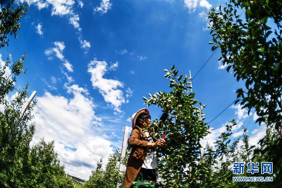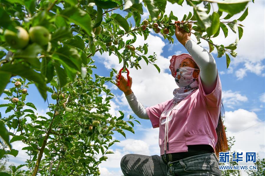 6月11日,農(nóng)民在貴州省威寧縣一處蘋(píng)果基地里疏果。近日,貴州省威寧彝族回族苗族自治縣的農(nóng)民搶抓農(nóng)時(shí),對(duì)蘋(píng)果園進(jìn)行疏果、除草等田間管理,呈現(xiàn)出一派夏管農(nóng)忙景象。威寧縣蘋(píng)果種植面積50余萬(wàn)畝,蘋(píng)果產(chǎn)業(yè)已逐步成為當(dāng)?shù)剞r(nóng)民增收致富的主導(dǎo)產(chǎn)業(yè)之一。新華社記者楊文斌攝。