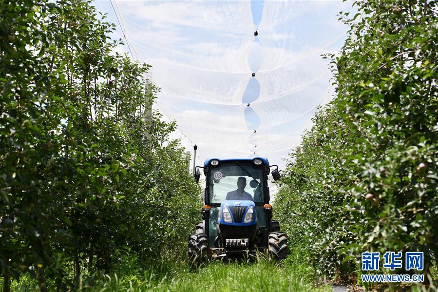 6月11日,農(nóng)民在貴州省威寧縣一處蘋(píng)果基地里駕駛農(nóng)機(jī)管護(hù)果園。近日,貴州省威寧彝族回族苗族自治縣的農(nóng)民搶抓農(nóng)時(shí),對(duì)蘋(píng)果園進(jìn)行疏果、除草等田間管理,呈現(xiàn)出一派夏管農(nóng)忙景象。威寧縣蘋(píng)果種植面積50余萬(wàn)畝,蘋(píng)果產(chǎn)業(yè)已逐步成為當(dāng)?shù)剞r(nóng)民增收致富的主導(dǎo)產(chǎn)業(yè)之一。新華社記者楊文斌攝。