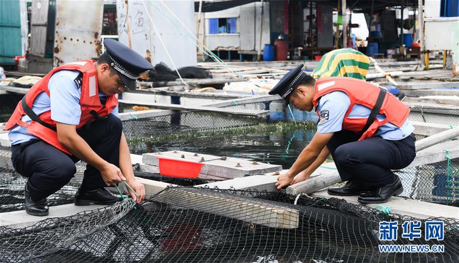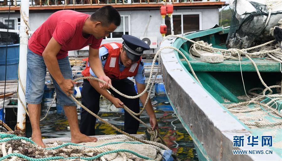 6月13日,海南省公安廳海岸警察總隊(duì)(籌備組)陵水支隊(duì)民警幫助轄區(qū)內(nèi)漁民固定漁排。當(dāng)日,海南省氣象局于16時30分繼續(xù)發(fā)布臺風(fēng)四級預(yù)警。今年第2號臺風(fēng)“鸚鵡”(熱帶風(fēng)暴級)預(yù)計(jì)于14日在廣東沿海登陸。新華社記者楊冠宇攝。
