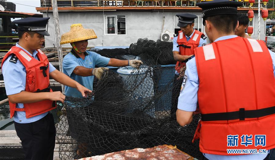 6月13日,海南省公安廳海岸警察總隊(duì)(籌備組)陵水支隊(duì)民警幫助轄區(qū)內(nèi)漁民整理漁網(wǎng)。當(dāng)日,海南省氣象局于16時30分繼續(xù)發(fā)布臺風(fēng)四級預(yù)警。今年第2號臺風(fēng)“鸚鵡”(熱帶風(fēng)暴級)預(yù)計(jì)于14日在廣東沿海登陸。新華社記者楊冠宇攝。