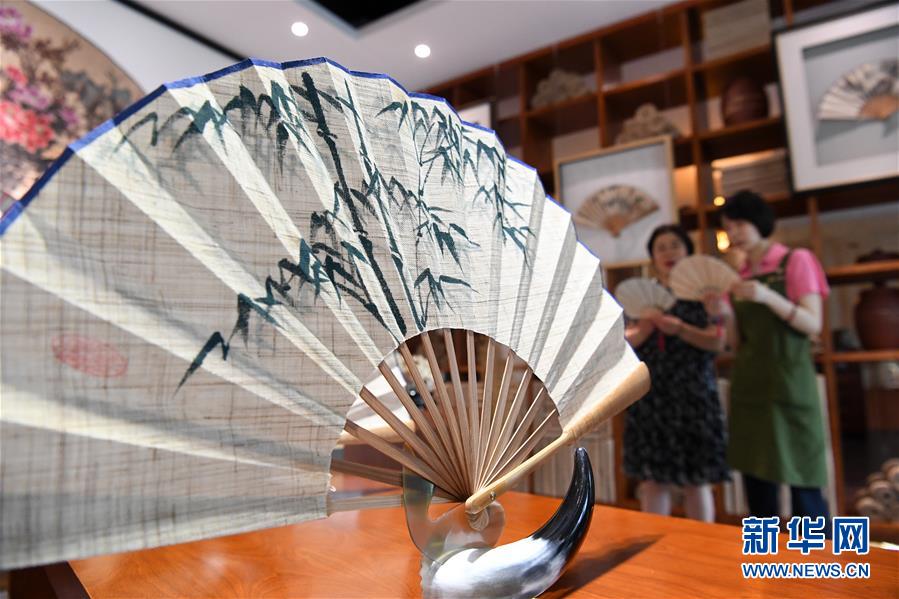 6月12日,非遺傳承人馬仁芬(左)與馬琳沁在探討夏布折扇的創(chuàng)新設計。新華社記者 唐奕 攝