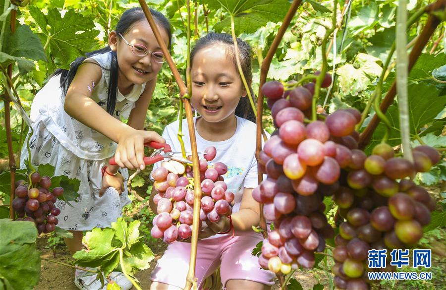 6月14日,小游客在河北省永清縣龍虎莊鄉(xiāng)劉莊村大棚內采摘葡萄。