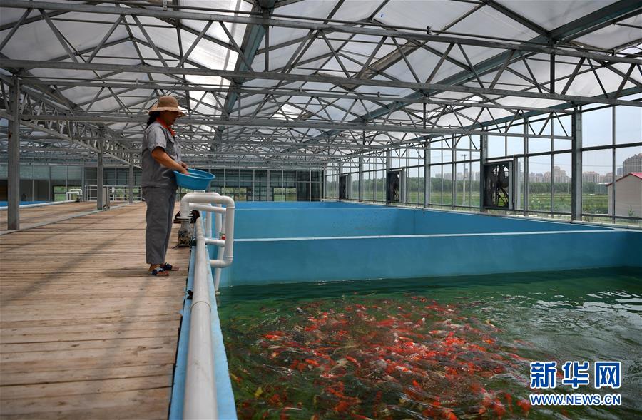 在天津現(xiàn)代晨輝科技集團(tuán)有限公司的養(yǎng)殖示范場,工人在投喂飼料(6月15日攝)。近年來,天津市寶坻區(qū)大白莊鎮(zhèn)大力發(fā)展觀賞魚養(yǎng)殖,在當(dāng)?shù)佚堫^企業(yè)的帶動下,成為增加農(nóng)民收入的新途徑。據(jù)了解,企業(yè)對附近養(yǎng)殖戶統(tǒng)一提供苗種、飼料、技術(shù)支持,以及觀賞魚成魚后保價(jià)回收的服務(wù)。養(yǎng)殖戶每畝水面平均收入約1.8萬元,解決周邊農(nóng)民就業(yè)近200人。新華社記者 李然 攝