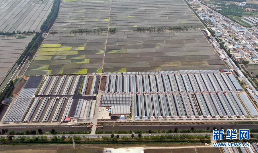 在遼寧省盤(pán)錦市大洼區(qū)新興鎮(zhèn)拍攝的劉廣會(huì)經(jīng)營(yíng)的現(xiàn)代化育苗大棚(6月9日攝,無(wú)人機(jī)照片)。新華社記者 楊青 攝