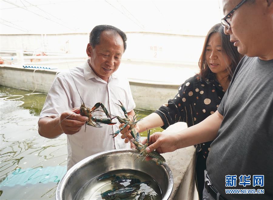 6月16日,在盧龍縣印莊鄉(xiāng)榆林甸村永新水產(chǎn)養(yǎng)殖專業(yè)合作社的養(yǎng)殖基地,養(yǎng)殖戶劉玉永(左)與河北省海洋與水產(chǎn)科學(xué)研究院科研人員探討澳洲淡水龍蝦養(yǎng)殖技術(shù)。新華社記者 楊世堯 攝
