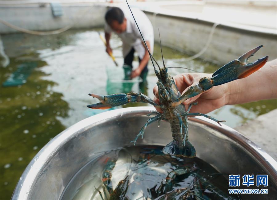 6月16日,在盧龍縣印莊鄉(xiāng)榆林甸村永新水產(chǎn)養(yǎng)殖專業(yè)合作社的養(yǎng)殖基地,養(yǎng)殖戶劉玉永在展示一只澳洲淡水龍蝦。新華社記者 楊世堯 攝