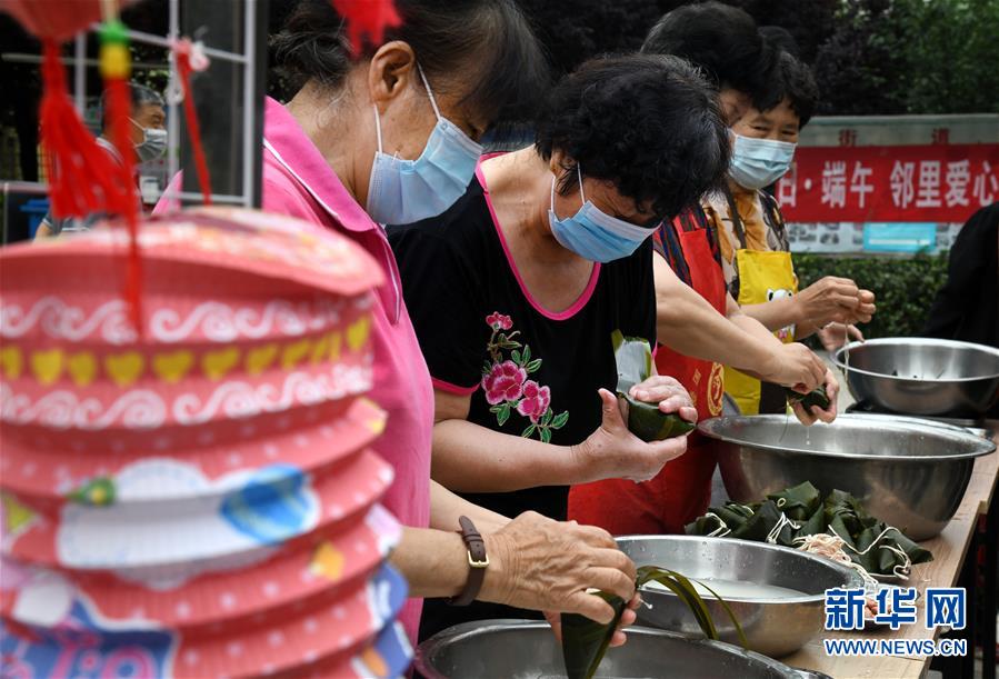 6月17日,水清溝街道居民在社區(qū)廣場上包粽子。當日,青島市北區(qū)水清溝街道開展迎端午鄰里愛心傳遞進網格活動,居民通過包粽子、吃粽子、網上端午傳統(tǒng)文化課等形式傳遞鄰里愛心,傳承民俗文化。新華社記者 李紫恒 攝