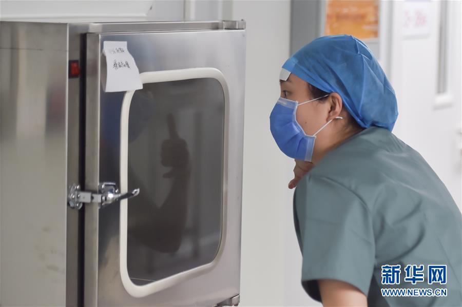 6月19日,在北京地壇醫(yī)院隔離病房內(nèi),護(hù)士穿上同事送來的降溫馬甲后,向同事打招呼感謝。新華社記者彭子洋攝