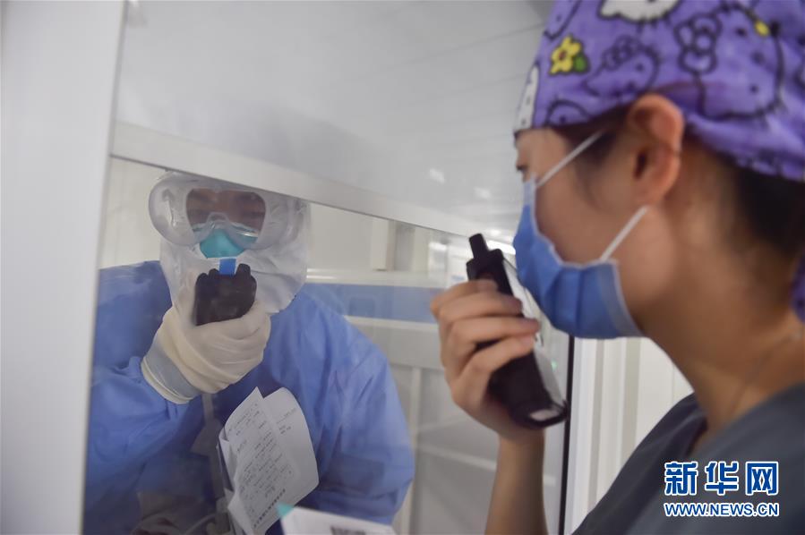 6月19日,在北京地壇醫(yī)院隔離病房內(nèi),護(hù)士正在用對(duì)講機(jī)和外面交流。新華社記者彭子洋攝