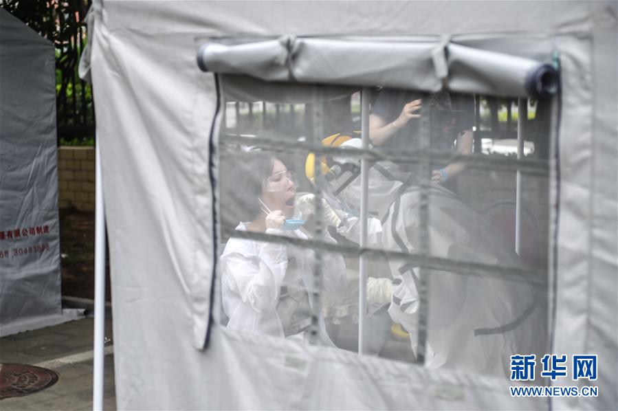 6月15日,在北京市東城區(qū)地壇體育館外的采樣點,市民在進行核酸檢測采樣。新華社記者彭子洋攝