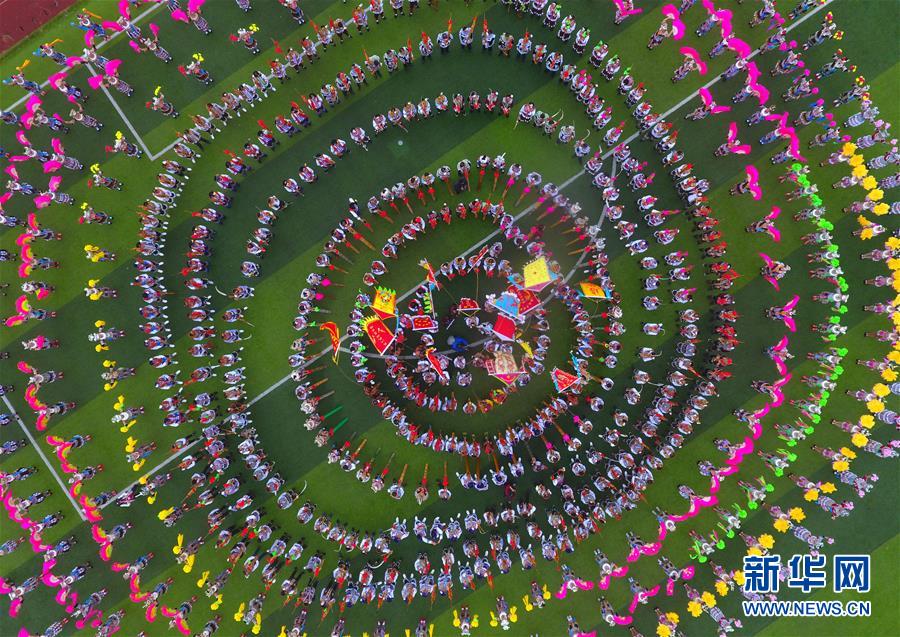在廣西融水苗族自治縣民族體育公園,當(dāng)?shù)厝罕娫谔J笙斗馬節(jié)開幕式上表演歌舞(無人機(jī)照片,2017年11月18日攝)。新華社記者黃孝邦攝