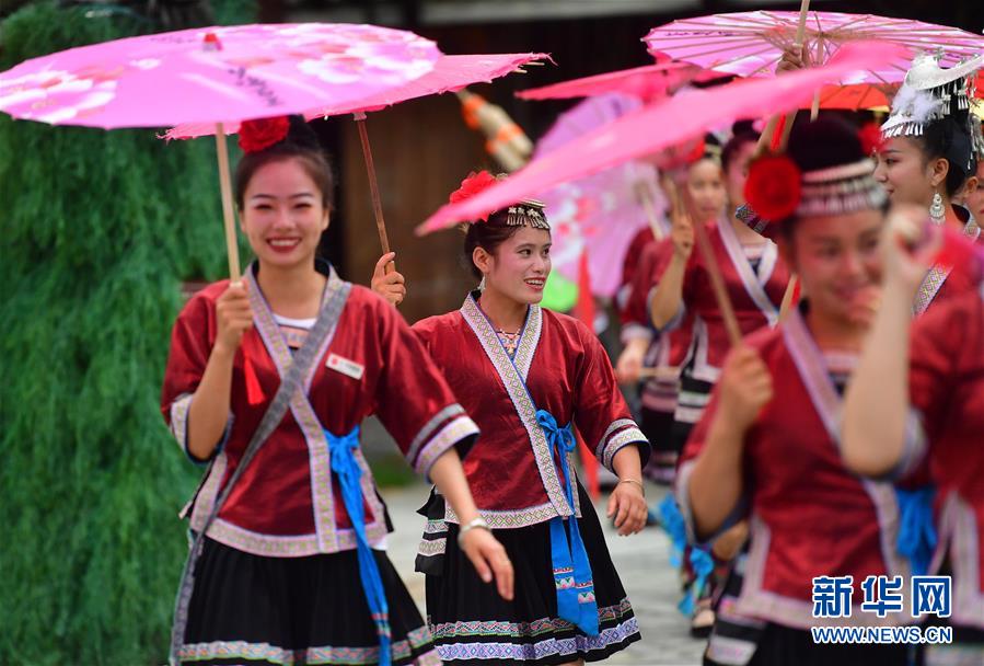 在廣西融水雙龍溝森林旅游度假區(qū)夢嗚苗寨,搬遷過來的苗族姑娘準(zhǔn)備給游客表演民族舞蹈(6月21日攝)。近年來,融水打造原生態(tài)苗族文化體驗(yàn)園——夢嗚苗寨,讓搬遷進(jìn)城的貧困戶住進(jìn)復(fù)原建設(shè)的老房子。景區(qū)提供綠化保潔、游樂設(shè)施管理、民族歌舞表演等工作崗位,多渠道增加貧困戶收入。新華社記者黃孝邦攝
