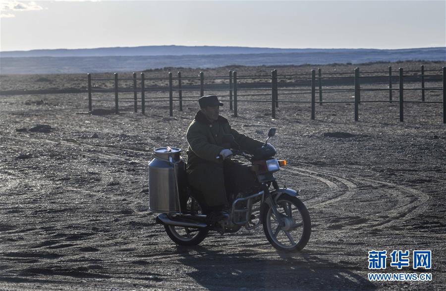 在吉木乃縣萬駝園內,傍晚時分,牧民米拉木別克·阿依提克準備騎著摩托車將駱駝趕回圈內(6月21日攝)。