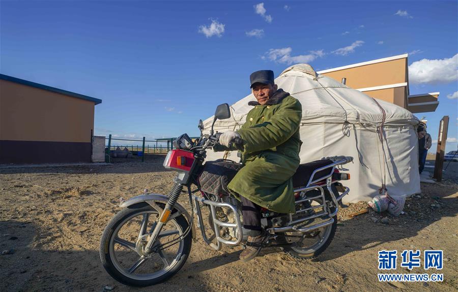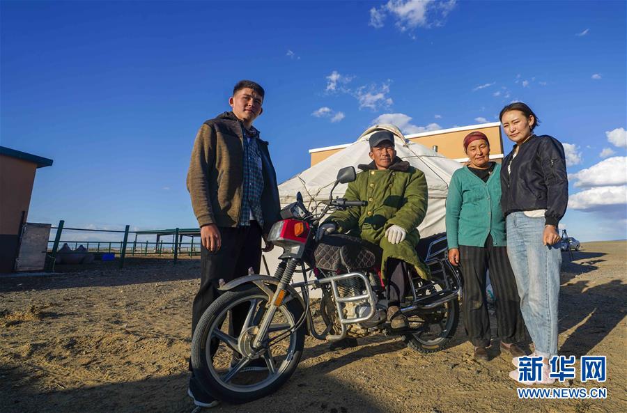 在吉木乃縣萬(wàn)駝園內(nèi),牧民米拉木別克·阿依提克(右)在兒子的幫助下準(zhǔn)備騎著摩托車(chē)去交駝奶(6月21日攝)。新華社記者趙戈攝