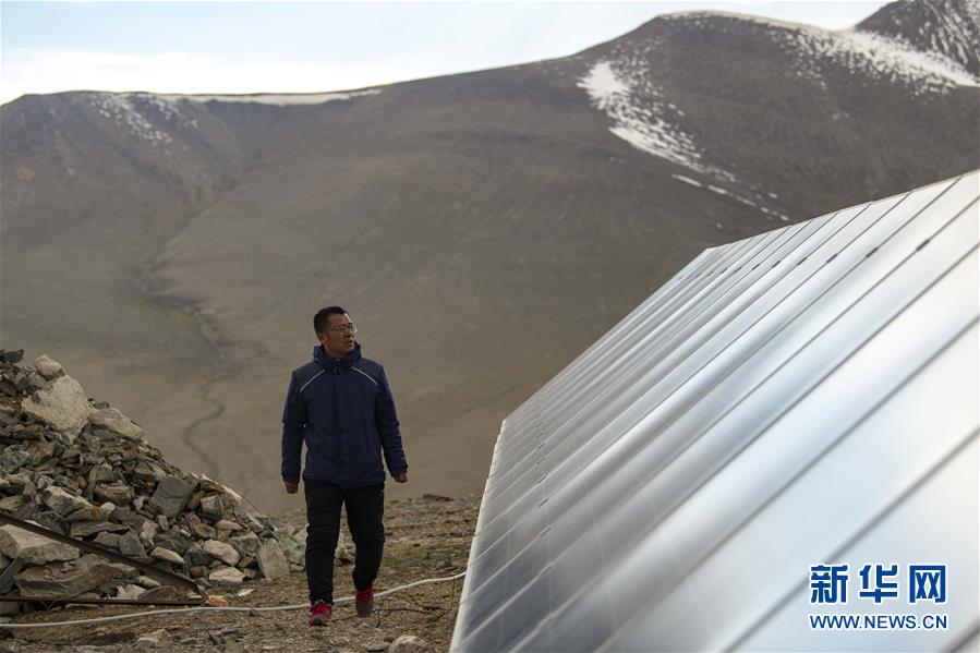 在中國(guó)科學(xué)院新疆天文臺(tái)慕士塔格觀測(cè)站,馮國(guó)杰檢查太陽(yáng)能光伏電板的運(yùn)行情況(6月15日攝)。新華社記者胡虎虎攝