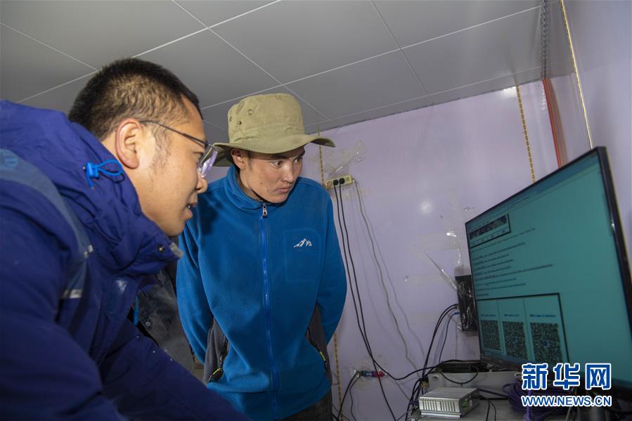 在中國(guó)科學(xué)院新疆天文臺(tái)慕士塔格觀測(cè)站,馮國(guó)杰(左)為助理觀測(cè)員阿克力·圖拉提講解當(dāng)晚觀測(cè)要點(diǎn)(6月15日攝)。新華社記者胡虎虎攝