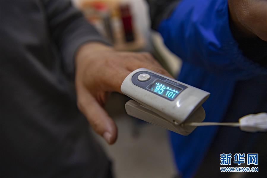 在位于新疆阿克陶縣布倫口鄉(xiāng)蘇巴什村的生活區(qū),天文科技工作者馮國(guó)杰用指夾式脈搏血氧儀檢查身體狀態(tài)(6月15日攝)。新華社記者胡虎虎攝