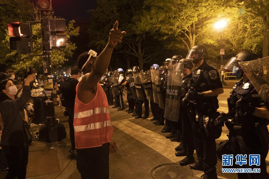 6月22日,警察和示威者在美國華盛頓白宮附近對峙。美國警察和示威者22日晚在首都華盛頓市白宮北側(cè)拉斐特廣場發(fā)生沖突并對峙。美國總統(tǒng)特朗普在社交媒體上說,許多人因破壞廣場上美國前總統(tǒng)安德魯·杰克遜的雕像及附近圣約翰圣公會教堂被逮捕。新華社記者劉杰攝