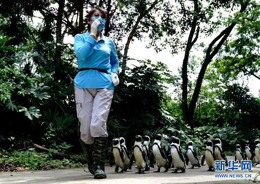 6月26日,上海動物園飼養(yǎng)員引導企鵝在園內漫步。端午小長假第二天,上海動物園開展“企鵝漫步科普行”活動,受到游客歡迎。新華社記者 張建松 攝