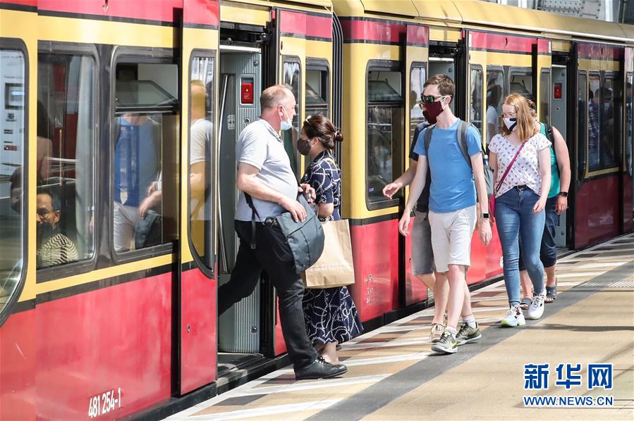 6月27日,在德國(guó)首都柏林,戴口罩的乘客出入一列城市快鐵列車。