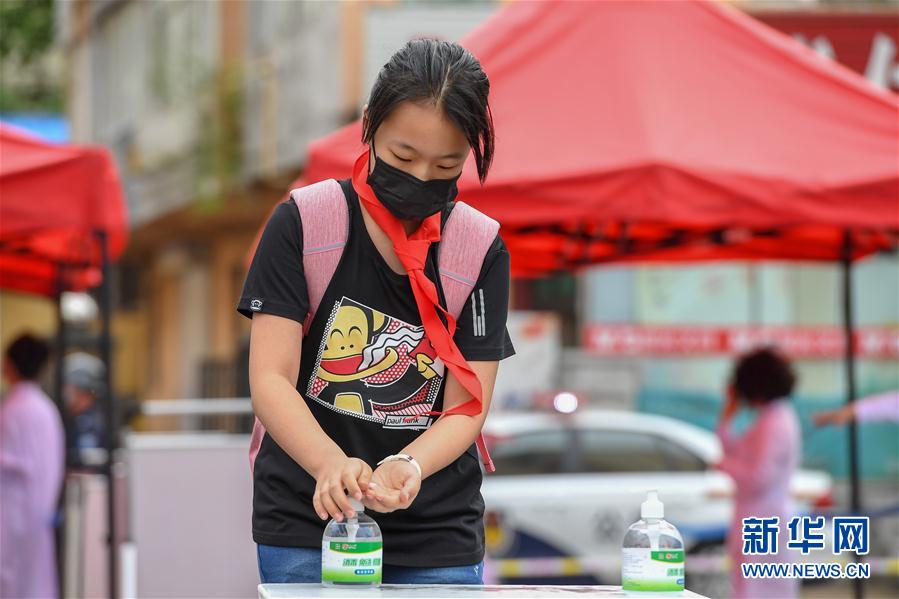 6月29日,在吉林市第一實(shí)驗(yàn)小學(xué),學(xué)生進(jìn)行手部消毒。新華社記者張楠攝