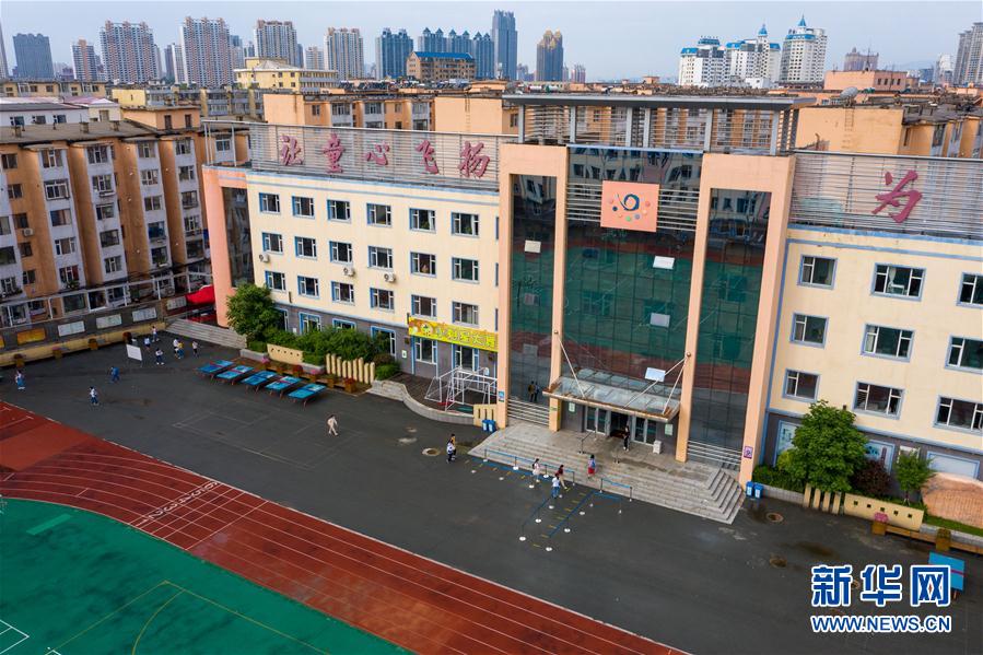 6月29日,在吉林市第一實(shí)驗(yàn)小學(xué),學(xué)生陸續(xù)進(jìn)入教學(xué)樓(無(wú)人機(jī)照片)。新華社記者張楠攝