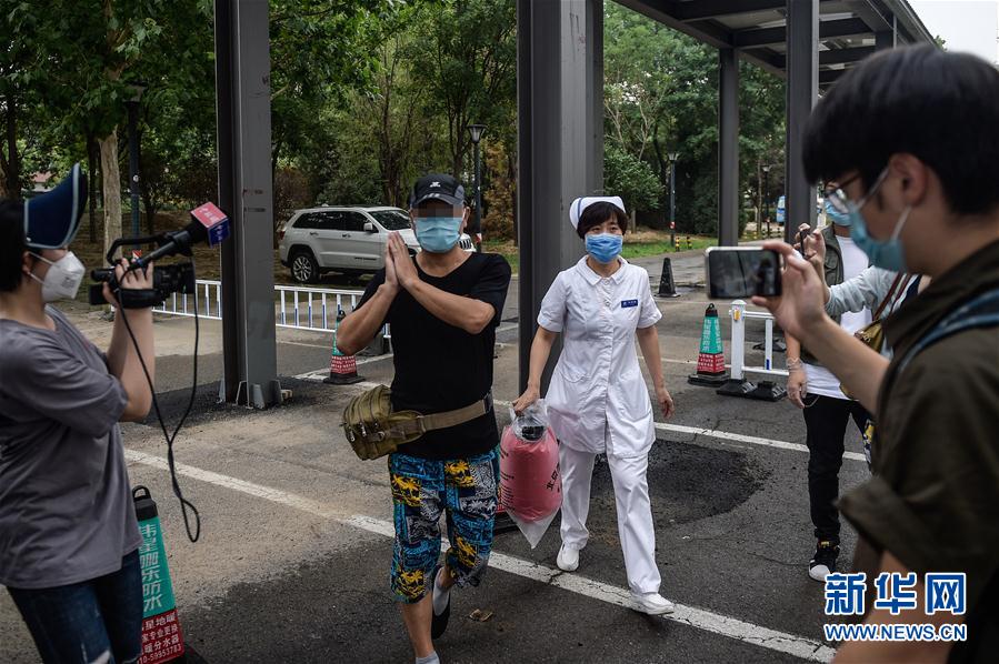 6月29日,在北京地壇醫(yī)院,患者何先生向媒體記者致意。新華社記者彭子洋攝