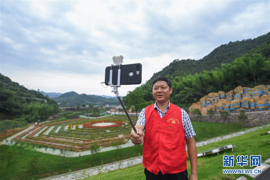 6月29日,新登鎮(zhèn)上山村黨總支書記汪衛(wèi)中通過手機直播推介當?shù)剜l(xiāng)村旅游景點。近日,浙江省杭州市富陽區(qū)新登鎮(zhèn)來自不同領(lǐng)域、有著不同身份的基層黨員們紛紛化身網(wǎng)絡“主播”,借助抖音、朋友圈等網(wǎng)絡載體,傾情推介家鄉(xiāng)的山鄉(xiāng)風貌、山鄉(xiāng)味道、山鄉(xiāng)民俗、山鄉(xiāng)風情。新華社記者徐昱攝