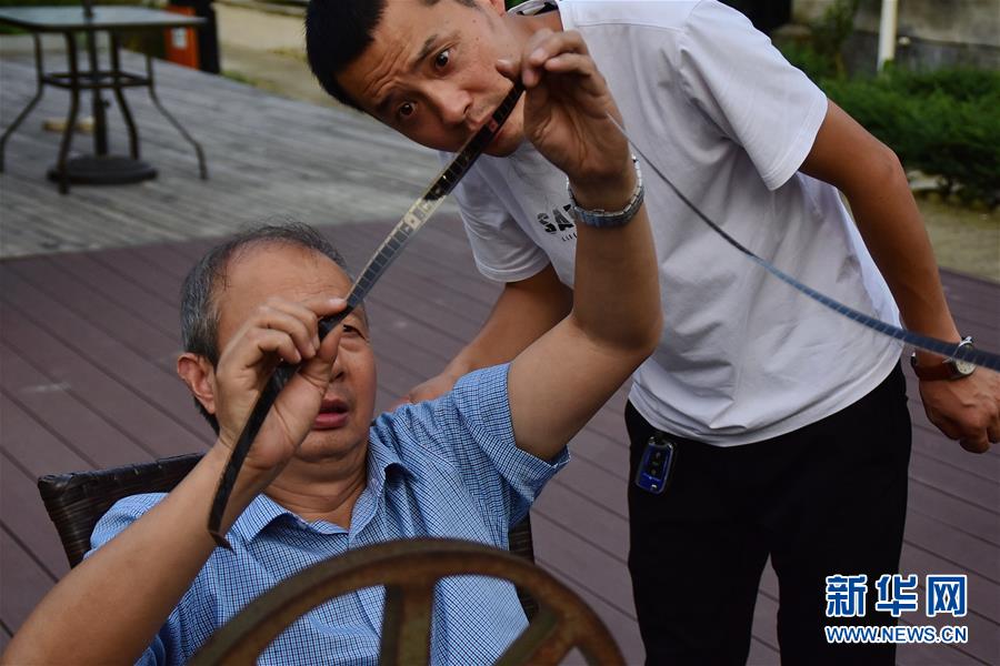 6月30日,朱生榮(左)和兒子朱強(右)在當(dāng)晚電影開播前檢查膠片位置。新華社記者鄭夢雨攝