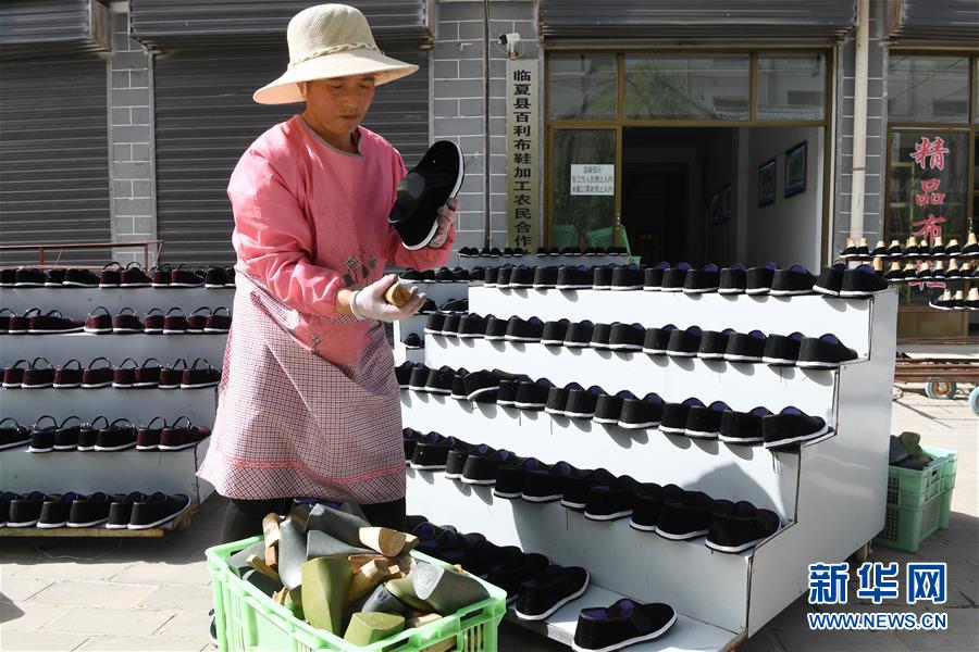 7月2日,臨夏縣百利布鞋加工農(nóng)民專業(yè)合作社員工在擺放布鞋。甘肅省臨夏回族自治州臨夏縣將布鞋加工定為重點(diǎn)扶持發(fā)展的產(chǎn)業(yè),采用“政府+公司+貧困戶”的產(chǎn)業(yè)扶貧模式,由政府主導(dǎo)、企業(yè)出資,在貧困村建設(shè)“扶貧車間”,吸納貧困群眾從事布鞋加工產(chǎn)業(yè)增加收入。截至2019年底,當(dāng)?shù)夭夹庸て髽I(yè)和加工戶遍及近百個(gè)行政村,從業(yè)人員達(dá)到4000多人,累計(jì)生產(chǎn)布鞋600多萬(wàn)雙,實(shí)現(xiàn)銷售收入2.32億元。新華社記者范培珅攝