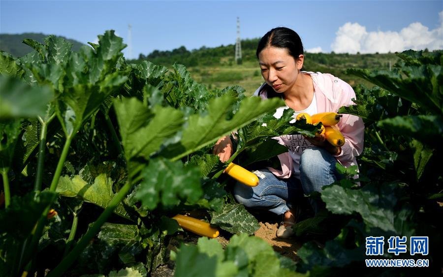 在陜西太白縣咀頭鎮(zhèn)咀頭街村供港蔬菜示范基地內(nèi),工作人員在采摘香蕉葫蘆(7月4日攝)。新華社記者劉瀟攝