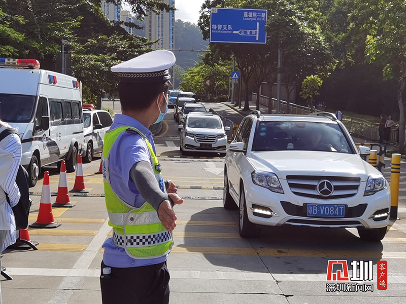 紅嶺中學(xué)考點(diǎn)門(mén)口正在指揮車(chē)輛通行的交警。