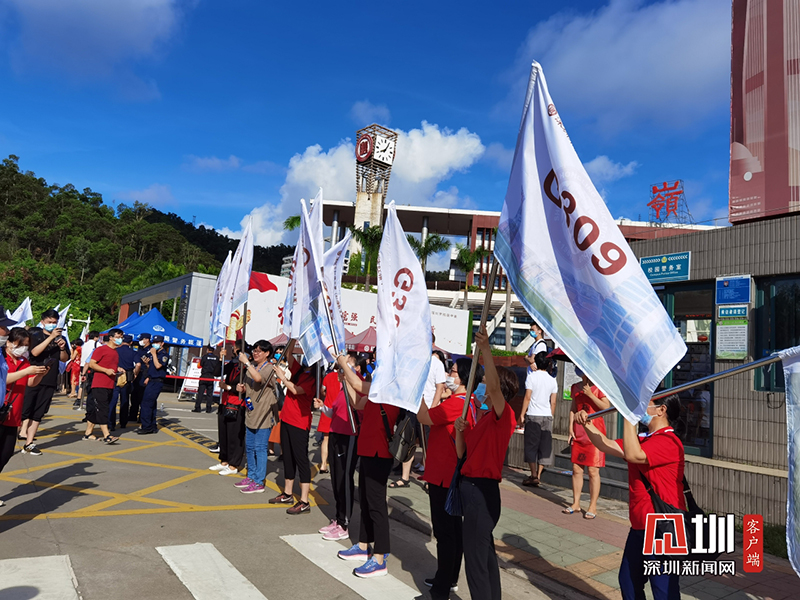 深圳紅嶺中學(xué)高三各班級(jí)家長(zhǎng)代表組成的家長(zhǎng)委員會(huì),在門(mén)口為高三考生助威加油。