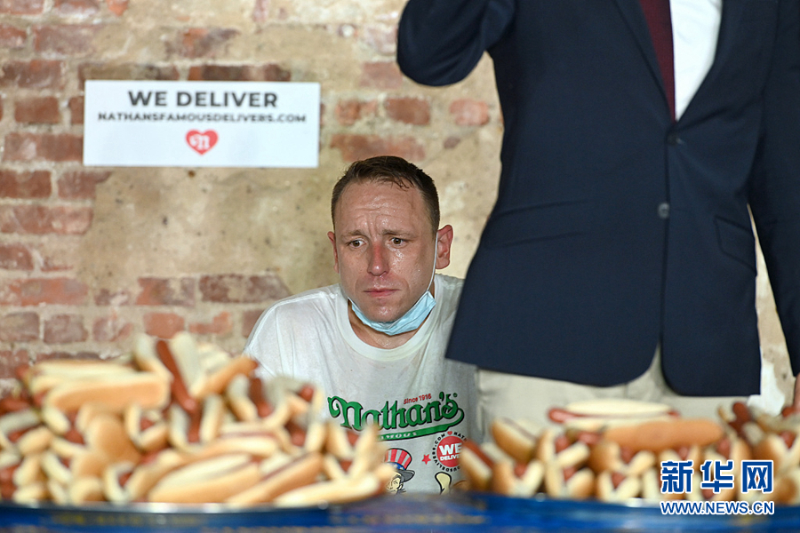 7月4日,美國(guó)紐約布魯克林舉行一年一度的國(guó)際吃熱狗比賽,喬伊·切斯納特以吃75個(gè)熱狗的成績(jī)贏得男子賽區(qū)冠軍,創(chuàng)下了新的世界紀(jì)錄。(圖片來(lái)源:視覺(jué)中國(guó))