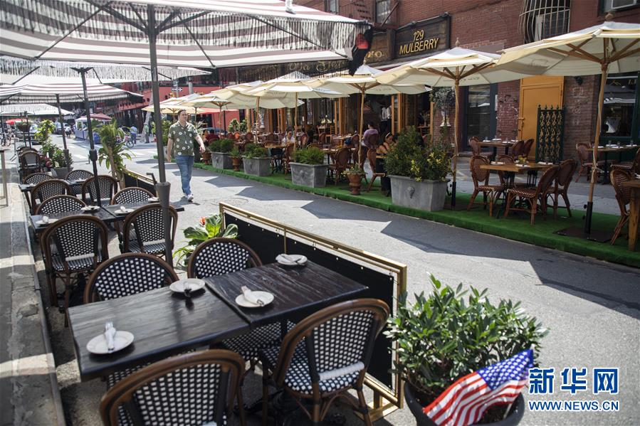 7月6日,一名男子從美國(guó)紐約一家餐廳的戶外餐區(qū)旁經(jīng)過(guò)。當(dāng)天,紐約進(jìn)入重啟第三階段,美甲店、按摩店等個(gè)人護(hù)理業(yè)在經(jīng)歷近4個(gè)月的停業(yè)后被允許重新開放。因防疫需要,原本應(yīng)在第三階段開放的餐飲業(yè)室內(nèi)就餐仍處于暫停狀態(tài)。新華社記者王迎攝