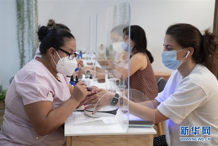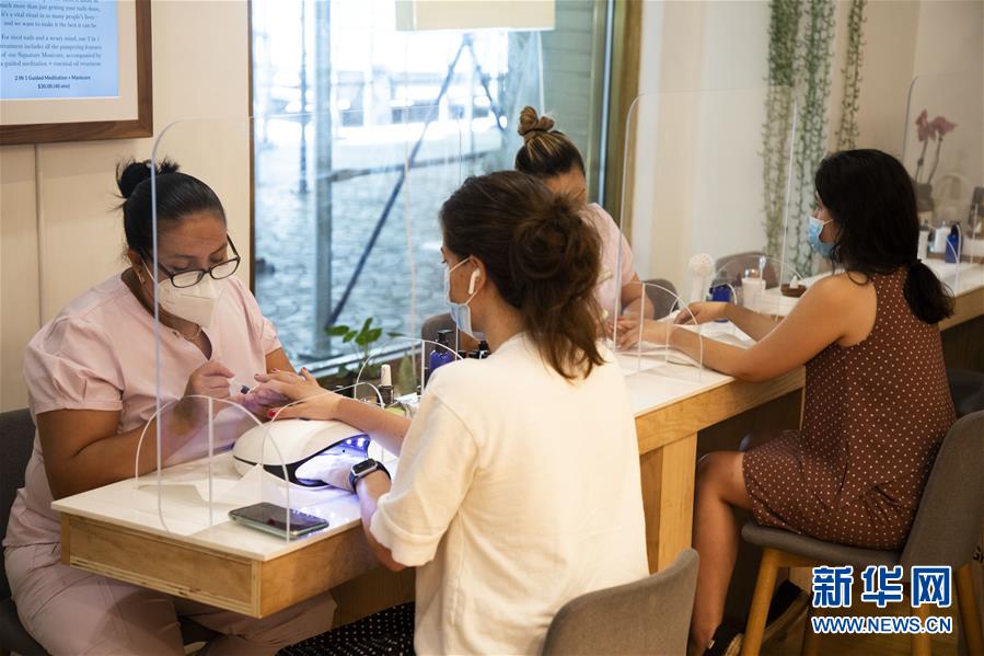 7月6日,技師在美國(guó)紐約一家美甲店為顧客美甲。當(dāng)天,紐約進(jìn)入重啟第三階段,美甲店、按摩店等個(gè)人護(hù)理業(yè)在經(jīng)歷近4個(gè)月的停業(yè)后被允許重新開放。因防疫需要,原本應(yīng)在第三階段開放的餐飲業(yè)室內(nèi)就餐仍處于暫停狀態(tài)。新華社記者王迎攝