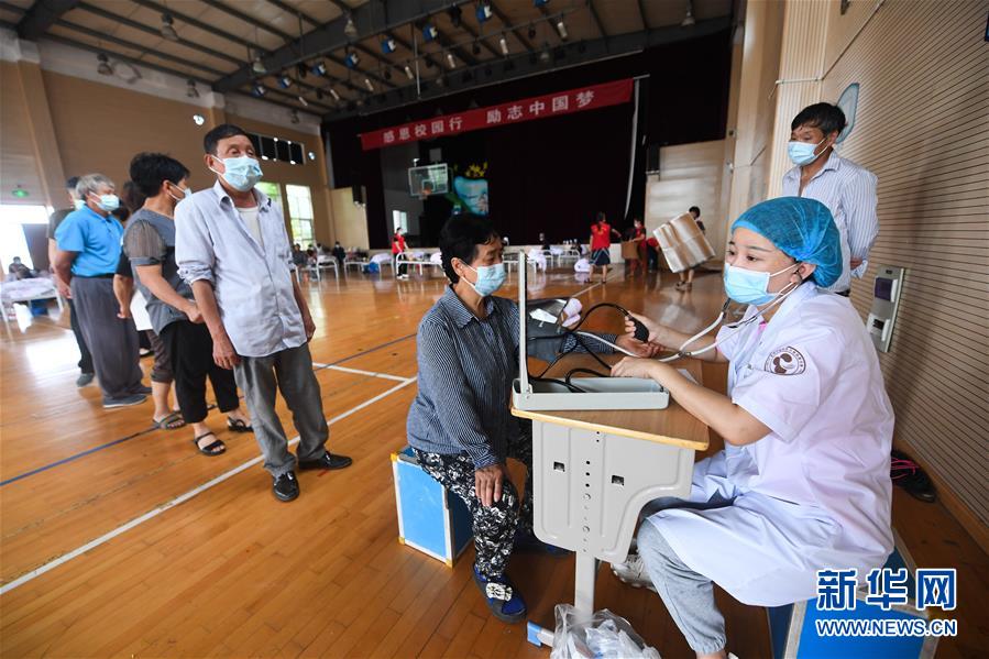 7月8日,在杭州市富陽(yáng)區(qū)東洲街道安置點(diǎn)東洲中心小學(xué),醫(yī)護(hù)人員在給村民測(cè)量血壓。新華社記者徐昱攝