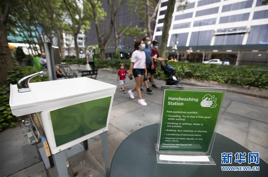7月8日,行人從美國(guó)紐約布萊恩特公園的洗手設(shè)施旁經(jīng)過。美國(guó)約翰斯·霍普金斯大學(xué)8日發(fā)布的新冠疫情最新統(tǒng)計(jì)數(shù)據(jù)顯示,美國(guó)累計(jì)確診病例超過300萬例。數(shù)據(jù)顯示,截至美國(guó)東部時(shí)間8日11時(shí)34分(北京時(shí)間23時(shí)34分),美國(guó)累計(jì)確診病例3016515例,累計(jì)死亡病例131594例。新華社記者王迎攝