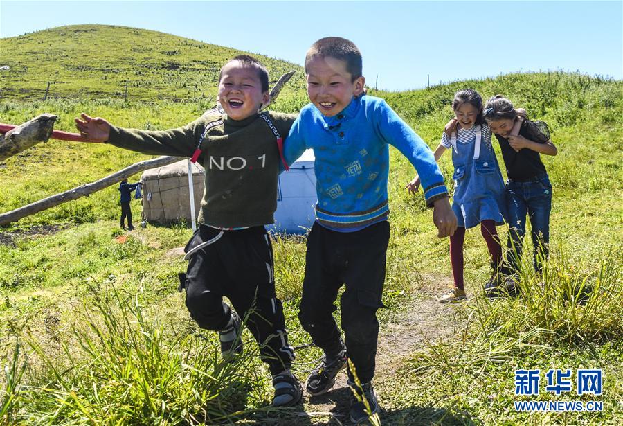 在新疆特克斯縣境內(nèi)的夏牧場(chǎng)里,小朋友在玩耍(7月2日攝)。新華社記者王菲攝