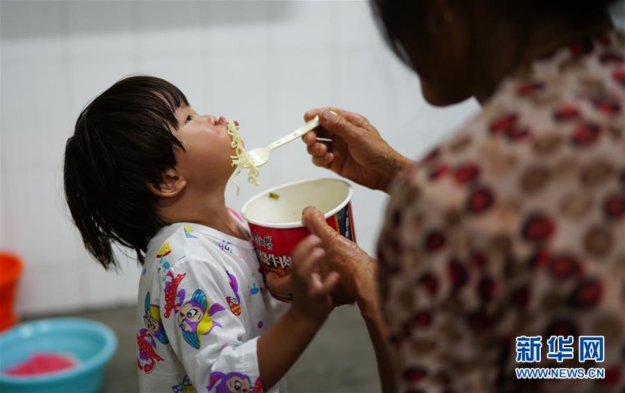 7月9日,村民在給小朋友喂飯。當(dāng)日,江西鄱陽縣鄱陽鎮(zhèn)因洪水受災(zāi)的村民被轉(zhuǎn)移到多個集中安置點(diǎn)。在鄱陽縣五一中心學(xué)校安置點(diǎn),志愿者和工作人員接到任務(wù)后不到十小時內(nèi),為被轉(zhuǎn)移村民布置了28間教室,供519人安頓,并為村民發(fā)放褥子、床單、枕頭、盒飯、飲用水等物資。新華社記者周密攝