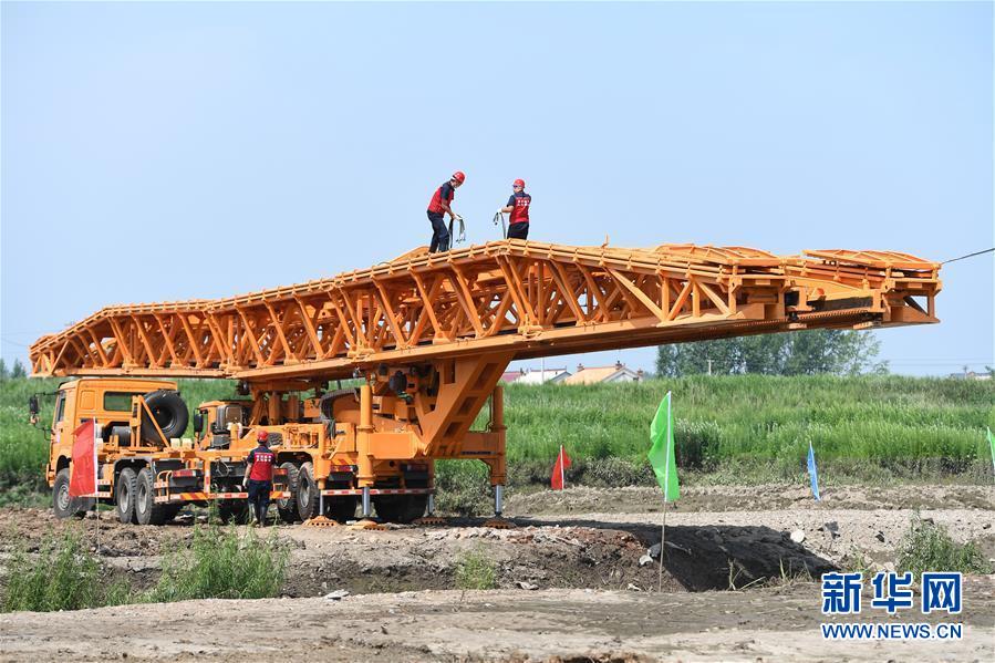 7月10日,工作人員在演練現(xiàn)場搭建機(jī)械化橋梁。當(dāng)日,由吉林省交通運(yùn)輸廳主辦的公路橋梁水毀搶通應(yīng)急演練在長春市雙陽區(qū)雙陽河舉行,參與演練人員從汛情水毀信息報(bào)送、應(yīng)急裝備快速集結(jié)、機(jī)械化橋梁搶通搭設(shè)、善后處理等方面進(jìn)行實(shí)戰(zhàn)演練。新華社記者張楠攝